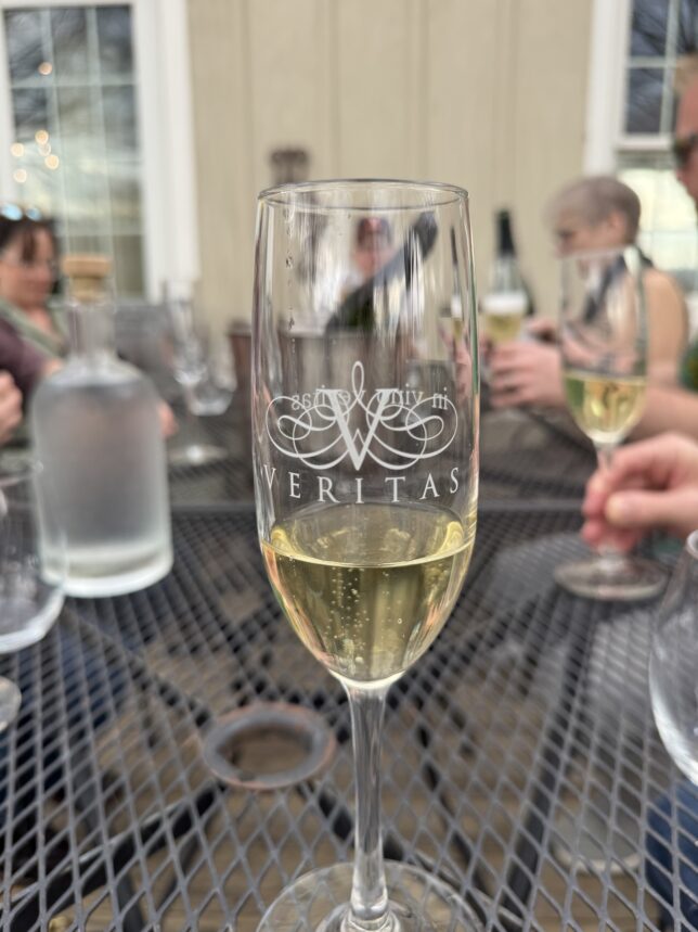 In the midst of our tasting at Flying Fox, George Hodson, President of Flying Fox Vineyards and general manager of Veritas Vineyards and Winery dropped by to offer a next adventure to Veritas Vineyards and Winery. It was there that we were treated to Scintilla, the delightfully refreshing sparkling wine, and library tastings of the 2017 Cabernet Franc and 2009 Meritage. I still have Virginia red wines from the 2017 on my wine rack, and these are still going strong. The 2017 growing season was hot and dry, so if deciding to drink or hold, feel comfortable to hold for a while longer. The 2017 Cabernet Franc from Veritas provided another example of why vintage matters. It was dense in color with elements of dark fruit and sweet tobacco with surprising length on the finish. A charcuterie board arrived at our table to heighten the tasting experience, and we continued to bask in the warm sunshine while sipping, nibbling and conversing.