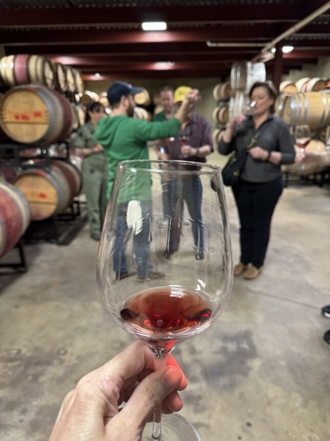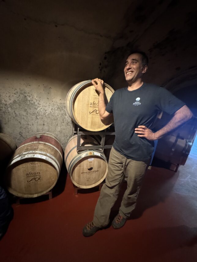 All adventures must come to an end, and our hosts concluded our day with a trip to Afton Mountain Vineyards. Damien Blanchon, recently recognized as Virginia Grower of the Year for 2025, greeted us and then led us to a tank and barrel room tour. Here too concrete eggs, or amphora in this case, proved to be a highlight of the tour. Blanchon echoed similar advantages of using concrete as Jordan at Pollak Vineyards. Blanchon’s goal is to eventually move away from new oak barrels entirely in favor of neutral oak barrels to highlight fruit components of the wines that tend to be masked by newer barrels. Good winemaking does indeed evolve over time.